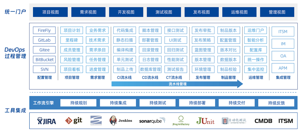 开发交付过程规范化/自动化,确保管理规范的有效执行,代码质量检测、单元测试自动化,减轻开发人 员工作的同时,规范开发工作过程。